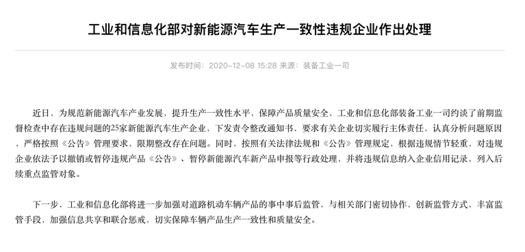 繼工信部對廣汽、比亞迪、吉利、北汽等25家新能源汽車生產(chǎn)企業(yè)監(jiān)督檢查后,12月8日,工信部對新能源汽車生產(chǎn)一致性違規(guī)企業(yè)作出處理。