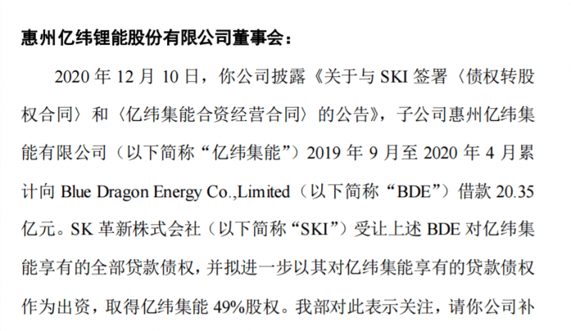 億緯鋰能收關(guān)注函:要求說明SKI擬獲得億緯集能股權(quán)比例的合理性
