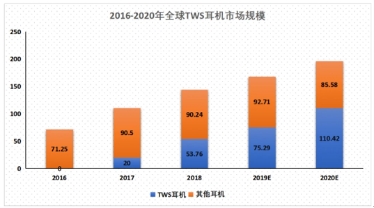 自2016年蘋果推出首款TWS耳機Airpods以來,無線藍(lán)牙耳機浪潮洶涌而至。據(jù)智研咨詢數(shù)據(jù)統(tǒng)計顯示,2017-2018年,全球TWS耳機市場規(guī)模由20億美元增至53.76億美元,全球TWS耳機出貨量由2000萬臺增長至6500萬臺。預(yù)計2020年全球TWS耳機市場規(guī)模將超過110億美元,出貨量也達(dá)到1.5億臺。更有業(yè)內(nèi)人士預(yù)測,未來5年TWS耳機出貨量將突破10億臺,成為將來耳機市場的“頭號玩家”。