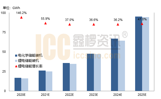 2020年,新能源發(fā)電并網(wǎng)配套儲(chǔ)能、5G基站備用電源儲(chǔ)能市場(chǎng)增速明顯,帶動(dòng)用戶側(cè)和發(fā)電側(cè)儲(chǔ)能在電化學(xué)儲(chǔ)能市場(chǎng)占比提升。據(jù)鑫欏資訊統(tǒng)計(jì),2020年國(guó)內(nèi)鋰電儲(chǔ)能裝機(jī)約16.2GWh,同比大幅增長(zhǎng)146.2%,在電化學(xué)儲(chǔ)能占比提高至93%以上,預(yù)計(jì)2021年鋰電儲(chǔ)能裝機(jī)需求達(dá)25.2GW和,同比增長(zhǎng)55.6%。