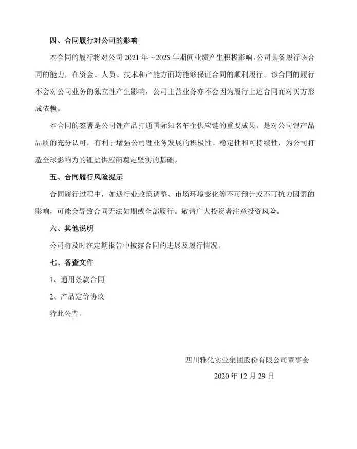 12月29日,四川雅化集團(tuán)發(fā)布公告稱,公司下屬全資子公司雅安鋰業(yè)與特斯拉簽訂電池級(jí)氫氧化鋰供貨合同,約定從2021年起至2025年,特斯拉向雅安鋰業(yè)采購(gòu)價(jià)值總計(jì)6.3億美元~8.8億美元的電池級(jí)氫氧化鋰產(chǎn)品。