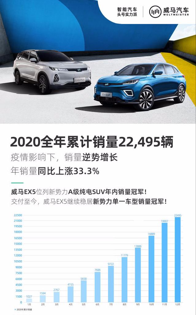 日前,威馬汽車公布2020年全年銷量以及四季度的交付數(shù)據(jù),威馬汽車2020全年累計(jì)銷量達(dá)22495輛,同比增長33.3%。威馬汽車在12月交付2588臺,第四個季度累計(jì)交付8609臺,環(huán)比上漲38.9%,四季度銷量創(chuàng)歷史新高。