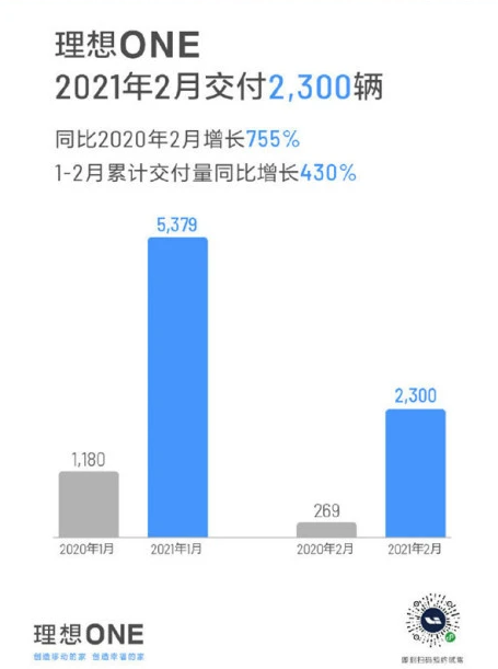 三月伊始,多家汽車廠商陸續(xù)公布了自家汽車的2月銷量情況。3月2日下午,理想汽車宣布,理想ONE 2月交付2300輛,同比2020年2月增長755%,1月-2月累計交付量同比增長430%。截至2月28日,理想ONE已累計交付超過4萬,達(dá)到41276輛。