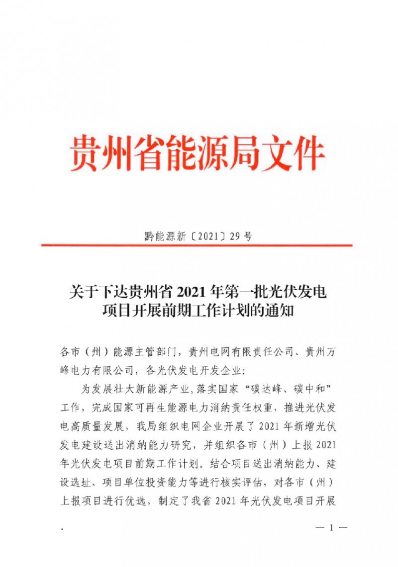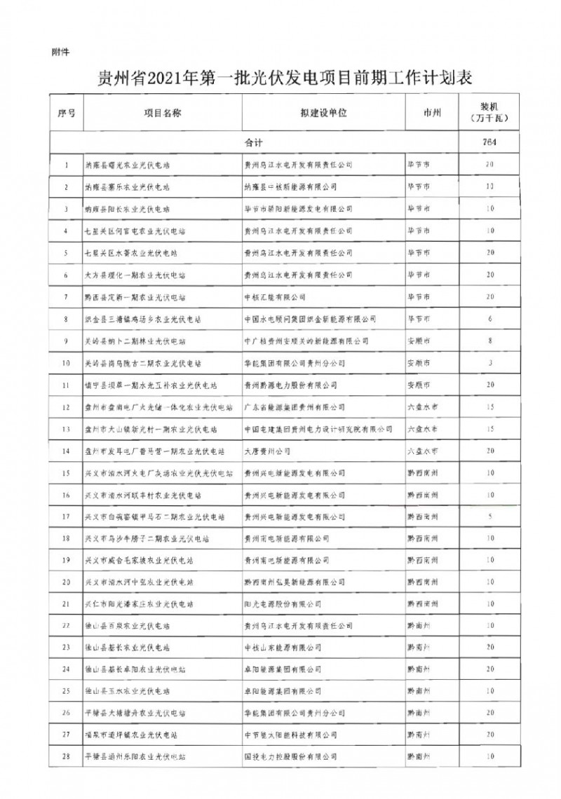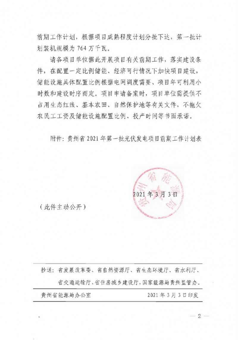 2021年3月3日,貴州省能源局發(fā)布了《關(guān)于下達貴州省2021年第一批光伏發(fā)電項目開展前期工作計劃的通知》,計劃裝機規(guī)模為7.64GW。