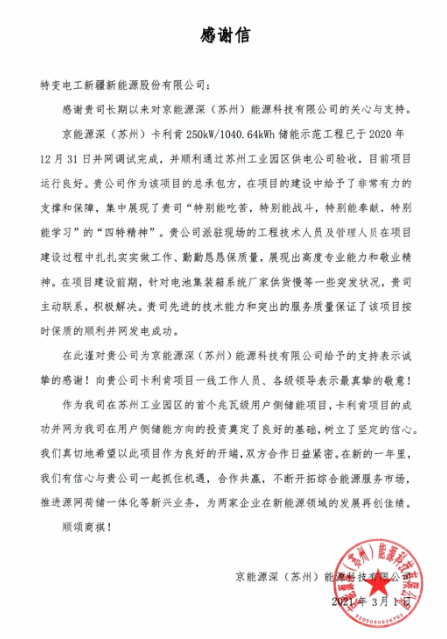 近日,由特變電工新能源承建的京能源深(蘇州)卡利肯250kW/1040.64kWh儲能示范工程(下稱:京能卡利肯儲能項(xiàng)目)收到一封來自業(yè)主方的珍貴感謝信,來信對特變電工新能源先進(jìn)的技術(shù)能力和卓越的服務(wù)質(zhì)量給予了充分肯定。