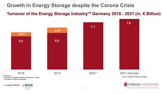 總的來說,BVES-能源咨詢公司的報告認為,盡管受到冠狀病毒危機的影響,但德國的儲能行業(yè)還是有所增長,從2018年約50億至56億歐元的營業(yè)額,到2019年約55億至63億歐元的營業(yè)額,再到2021年高達76億歐元。