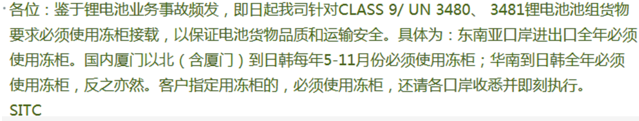 海豐國際宣布: 鑒于鋰電池業(yè)務事故頻發(fā),即日起我司針對CLASS 9/UN3480, 3481鋰電池組貨物要求必須使用凍柜接載,以保證電池貨物品質(zhì)和運輸安全。具體為:東南亞口岸進出口全年必須使用凍柜。國內(nèi)廈門以北(含廈門)到日韓每年5-11月份必須使用凍柜; 華南到日韓全年必須使用凍柜,反之亦然??蛻糁付ㄓ脙龉竦?,必須使用凍柜,還請各口岸收悉并即刻執(zhí)行。