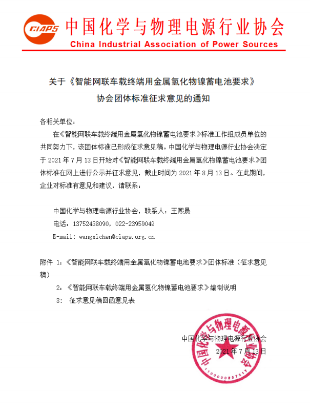 在《智能網(wǎng)聯(lián)車載終端用金屬氫化物鎳蓄電池要求》標準工作組成員單位的共同努力下,該團體標準已形成征求意見稿。中國化學與物理電源行業(yè)協(xié)會決定于2021年7月13日開始對《智能網(wǎng)聯(lián)車載終端用金屬氫化物鎳蓄電池要求》團體標準在網(wǎng)上進行公示并征求意見,截止時間為2021年8月13日。在此期間,企業(yè)對標準有意見和建議,請聯(lián)系: