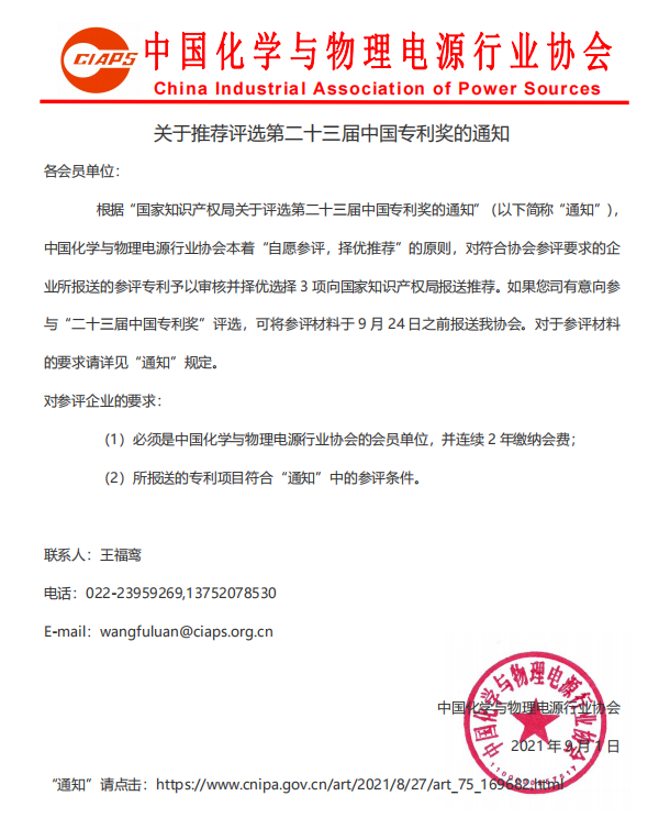 根據(jù)“國家知識產(chǎn)權(quán)局關(guān)于評選第二十三屆中國專利獎(jiǎng)的通知”(以下簡稱“通知”),中國化學(xué)與物理電源行業(yè)協(xié)會(huì)本著“自愿參評,擇優(yōu)推薦”的原則,對符合協(xié)會(huì)參評要求的企業(yè)所報(bào)送的參評專利予以審核并擇優(yōu)選擇3項(xiàng)向國家知識產(chǎn)權(quán)局報(bào)送推薦。如果您司有意向參與“二十三屆中國專利獎(jiǎng)”評選,可將參評材料于9月24日之前報(bào)送我協(xié)會(huì)。對于參評材料的要求請?jiān)斠?ldquo;通知”規(guī)定。
