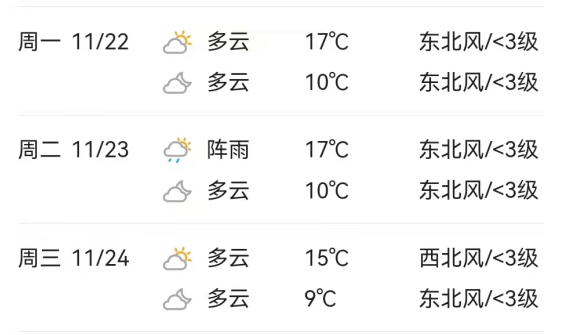 根據(jù)天氣預(yù)報,11月22日、23日、24日,蘇州地區(qū)以多云為主,溫度為17℃-10℃。