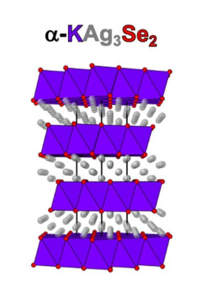 二維超離子導體α-KAg3Se2是四層原子結構。原子的顏色與原子的名字上的顏色一致。(圖片由Mercouri Kanatzidis、美國西北大學和阿貢國家實驗室提供)