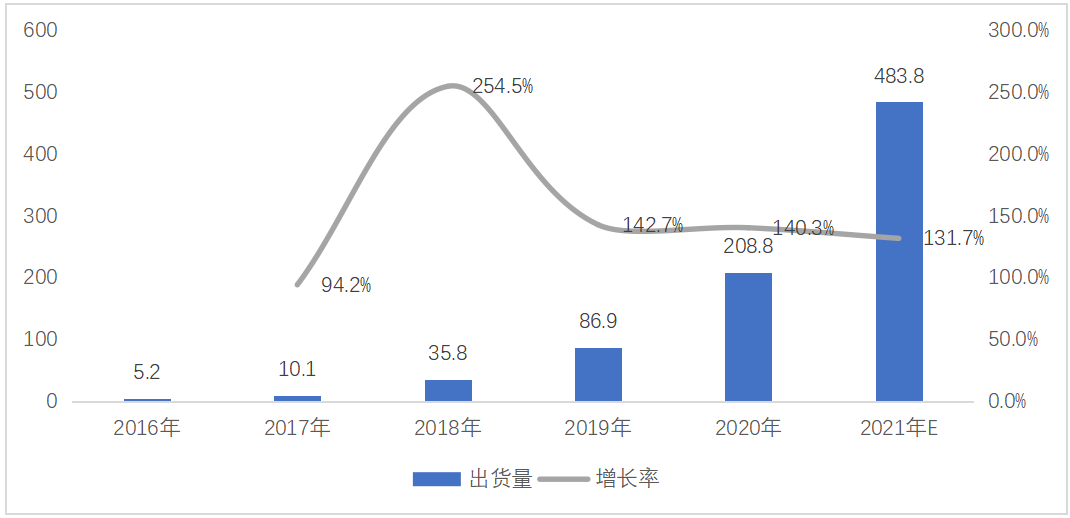 近年來,在手機(jī)、平板電腦等移動(dòng)智能終端應(yīng)用普及程度不斷提高的同時(shí),尋求自由、親近自然的戶外生活亦成為趨勢,戶外用電需求日益增加;此外,近年來自然災(zāi)害呈現(xiàn)多發(fā)態(tài)勢,供電穩(wěn)定性受到影響,應(yīng)急備用電源已逐步成為家庭生活中的重要備用品。在過去,戶外及應(yīng)急情況下的電力供應(yīng)主要采用小型燃油發(fā)電機(jī),但燃油發(fā)電機(jī)噪音大、操作復(fù)雜且污染環(huán)境,因此基于鋰電池等清潔能源技術(shù)的便攜式儲(chǔ)能行業(yè)逐步興起。同時(shí),受新能源汽車的發(fā)展帶動(dòng)上游鋰離子電池產(chǎn)業(yè)的成熟,便攜式儲(chǔ)能行業(yè)得到迅速發(fā)展。2016年,全球便攜式儲(chǔ)能設(shè)備僅出貨5.2萬臺(tái),預(yù)計(jì)2021年出貨量達(dá)到483.8萬臺(tái),年復(fù)合增長率達(dá)到148%。