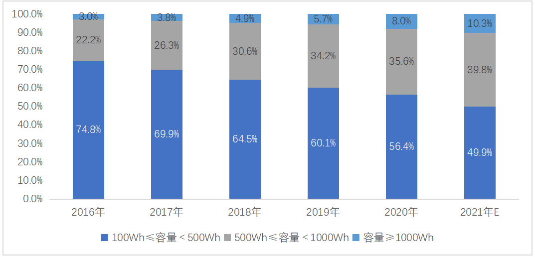 圖 16 2016-2021年不同容量產(chǎn)品份額變化趨勢