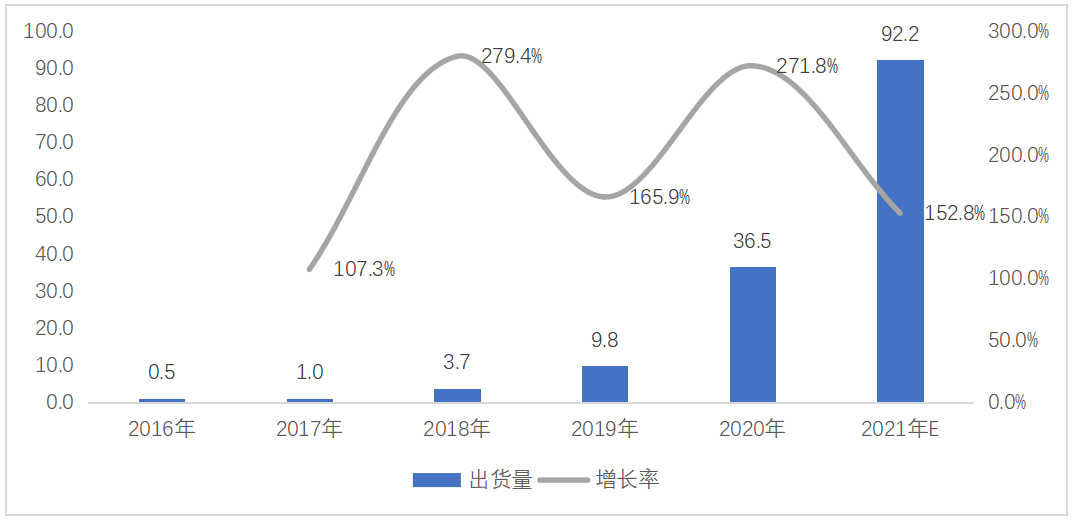 我國便攜式儲(chǔ)能行業(yè)是外向型特征十分明顯的行業(yè),全行業(yè)超過90%的產(chǎn)量出口,是世界便攜式儲(chǔ)能的制造大國和外貿(mào)出口大國。得益于我國新能源汽車、儲(chǔ)能和上游鋰電池行業(yè)的快速發(fā)展,便攜式儲(chǔ)能領(lǐng)域迅速發(fā)展壯大。2016年,中國便攜式儲(chǔ)能總出貨量4.8萬臺(tái),預(yù)計(jì)2021年總出貨量將達(dá)到438.8萬臺(tái),復(fù)合增長率達(dá)到146%。隨著經(jīng)濟(jì)的進(jìn)一步發(fā)展以及產(chǎn)品成本的進(jìn)一步下降,便攜式儲(chǔ)能產(chǎn)品的市場滲透率將持續(xù)提高,市場空間廣闊。