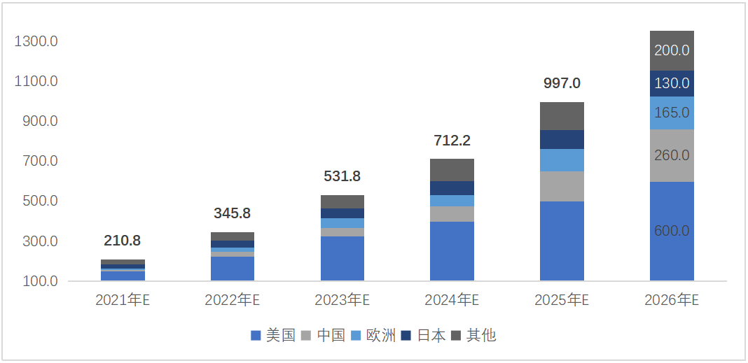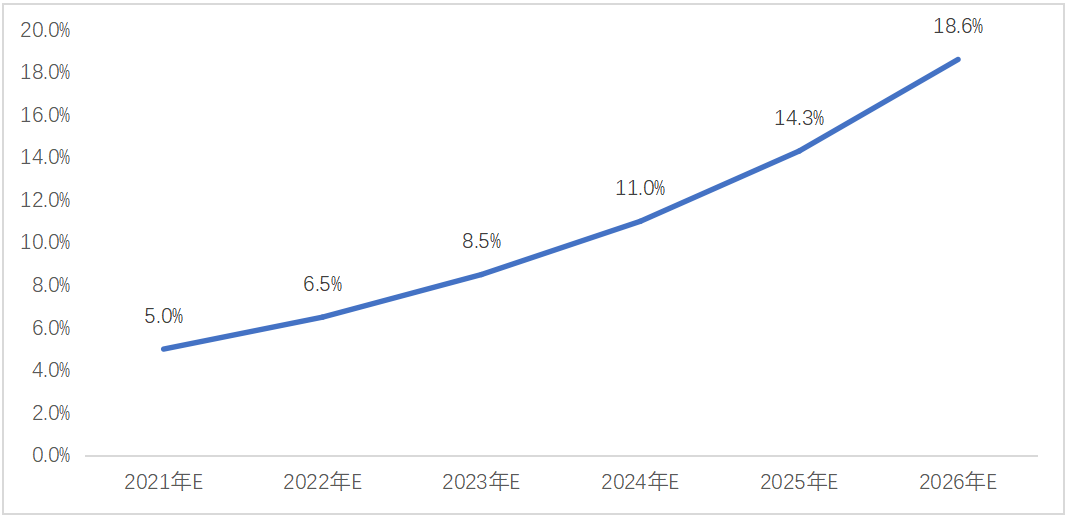 從戶外活動(dòng)總市場空間來看,預(yù)計(jì)2021年全球戶外活動(dòng)家庭數(shù)量約為15000萬戶,市場滲透率僅2.3%,預(yù)計(jì)到2026年,總數(shù)量將達(dá)到19300萬戶,按照便攜式儲(chǔ)能設(shè)備生命周期為3年計(jì)算,其戶外活動(dòng)市場滲透率可以達(dá)到15.9%。