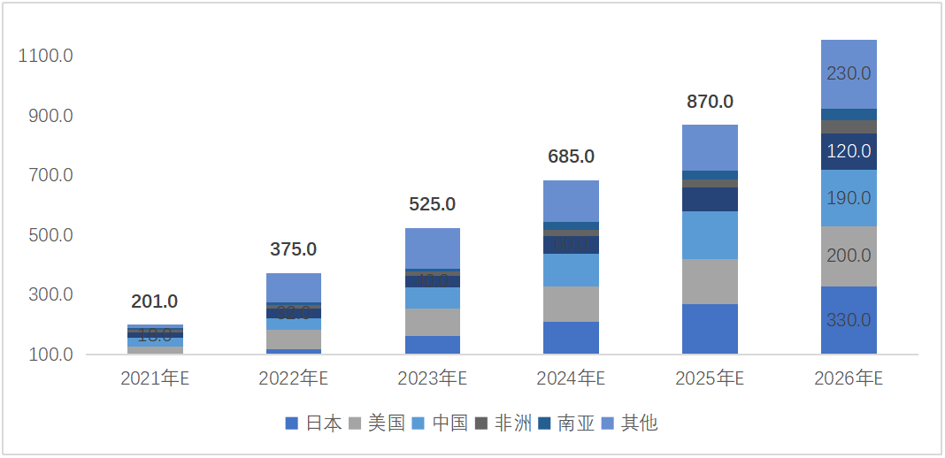 從不同地區(qū)需求數(shù)量來看,戶外活動(dòng)領(lǐng)域主要以美國為主,隨著市場滲透率的提升,預(yù)計(jì)2026年,美國戶外活動(dòng)新增需求將達(dá)到600萬臺(tái),中國市場逐漸提升,達(dá)到260萬臺(tái)左右,歐洲市場達(dá)到165萬臺(tái)左右,而日本由于戶外活動(dòng)和應(yīng)急領(lǐng)域有部分共同需求,因此單獨(dú)在戶外領(lǐng)域的新增需求僅130萬臺(tái)左右。