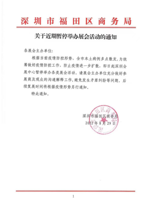 中國化學與物理電源行業(yè)協(xié)會原計劃于2022年9月25-29日在深圳會展中心舉辦“第六屆深圳國際新型儲能技術及工程應用展覽會CESE2022”。但最近幾天,深圳市多個區(qū)發(fā)生疫情,8月29日深圳市福田區(qū)商務局向各展會主辦單位發(fā)出“關于近期暫停舉辦展會活動的通知”:即日起深圳會展中心暫停舉辦展會活動。8月29日深圳市福田區(qū)新型冠狀病毒肺炎疫情防控指揮部發(fā)布“深圳市福田區(qū)新型冠狀病毒肺炎疫情防控指揮部通告(第281號)”,要求:大型會議、活動、論壇、演出、展銷促銷等暫停舉辦。