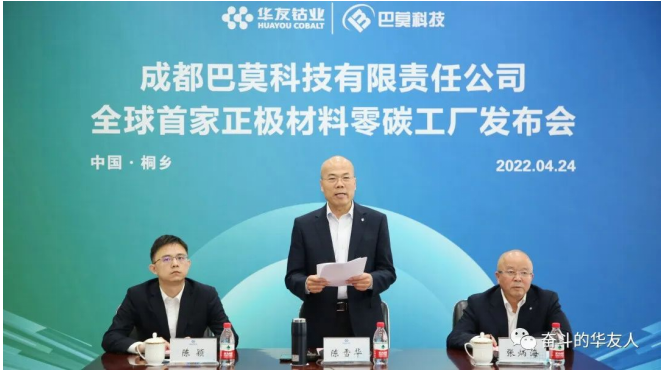 4月24日,華友鈷業(yè)成都巴莫科技有限責(zé)任公司全球首家正極材料“零碳”工廠發(fā)布會在成都召開。這是公司向碳中和目標(biāo)邁進的重要里程碑,華友將繼續(xù)積極探索低碳綠色發(fā)展路徑,為新能源產(chǎn)業(yè)發(fā)展、為我國碳達(dá)峰、碳中和目標(biāo)的達(dá)成做出積極貢獻(xiàn)。中國化學(xué)與物理電源行業(yè)協(xié)會秘書長劉彥龍出席發(fā)布會。SGS中國區(qū)副總裁谷曉宇,集團董事長陳雪華視頻同步出席發(fā)布會。發(fā)布會由集團總裁助理李天成主持。