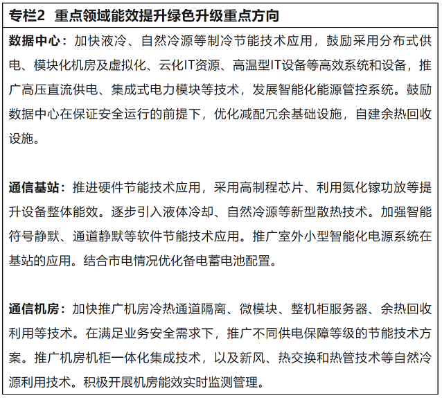 (二)推進(jìn)重點(diǎn)領(lǐng)域能效提升綠色升級(jí)。持續(xù)開(kāi)展國(guó)家綠色數(shù)據(jù)中心建設(shè),發(fā)布名單及典型案例,加強(qiáng)綠色設(shè)計(jì)、運(yùn)維和能源計(jì)量審查。引導(dǎo)數(shù)據(jù)中心擴(kuò)大綠色能源利用比例,推動(dòng)老舊數(shù)據(jù)中心實(shí)施系統(tǒng)節(jié)能改造。支持制造企業(yè)加強(qiáng)綠色設(shè)計(jì),提高網(wǎng)絡(luò)設(shè)備等信息處理設(shè)備能效。推動(dòng)低功耗芯片等產(chǎn)品和技術(shù)在移動(dòng)通信網(wǎng)絡(luò)中的應(yīng)用,推動(dòng)電源、空調(diào)等配套設(shè)施綠色化改造。到2025年,新建大型、超大型數(shù)據(jù)中心電能利用效率(PUE,指數(shù)據(jù)中心總耗電量與信息設(shè)備耗電量的比值)優(yōu)于1.3。