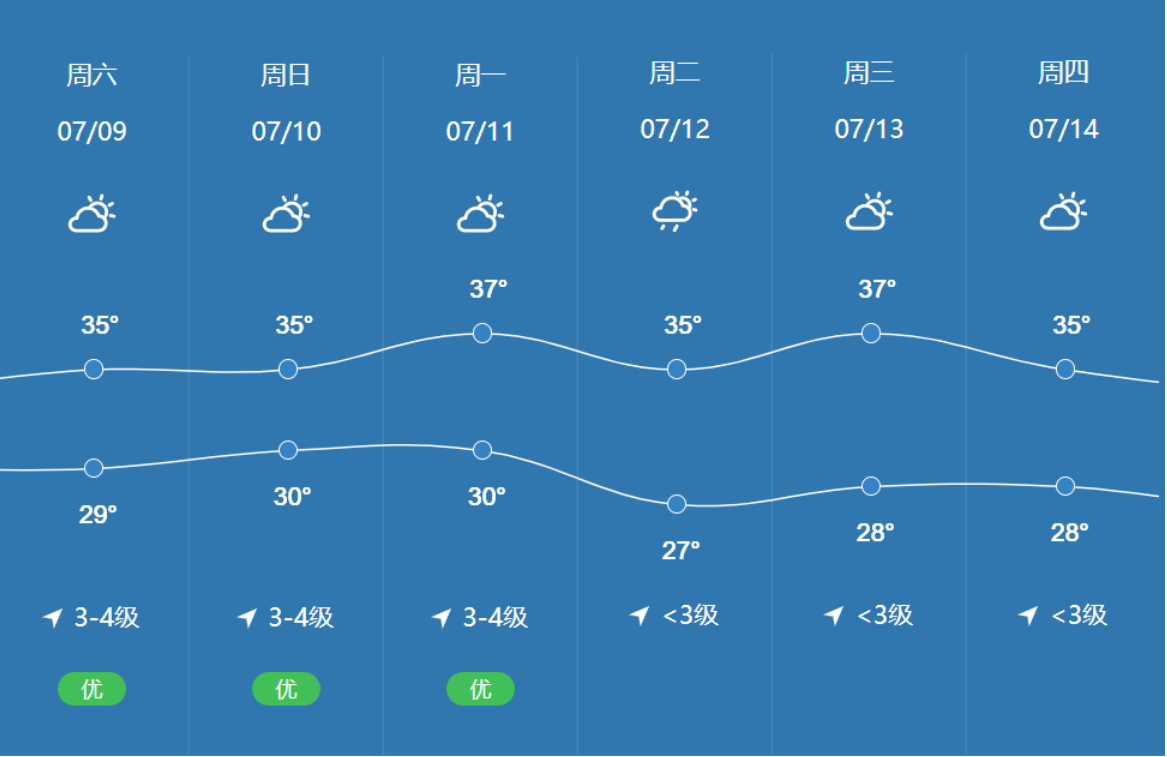根據(jù)天氣預(yù)報(bào),7月9日-14日,蘇州地區(qū)天氣情況如下: