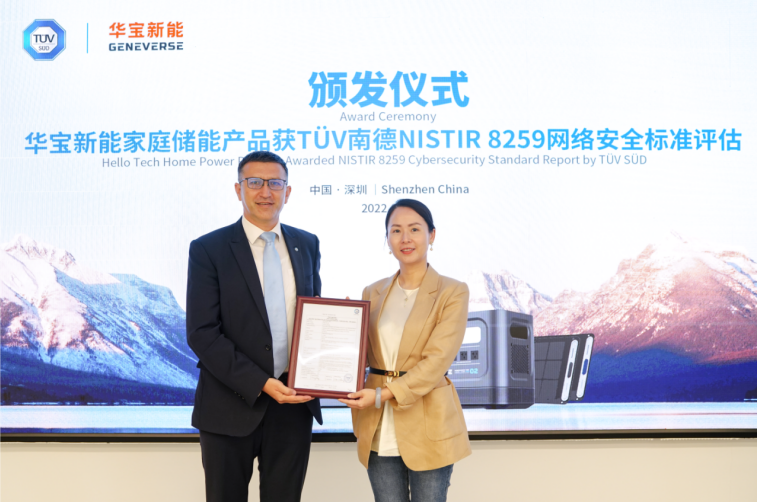 儀式上,TÜV南德 Mr. Gosav Radu Cristian宣布Geneverse GE-1200B順利通過TÜV南德基于美國NISTIR 8259網(wǎng)絡(luò)安全標(biāo)準(zhǔn)評(píng)估,并向華寶新能頒發(fā)評(píng)估報(bào)告。副董事長溫美嬋女士代表華寶新能對(duì)TÜV南德意志集團(tuán)和涂鴉智能在本次項(xiàng)目中提供的服務(wù)和技術(shù)支持表示感謝,同時(shí)也希望未來與兩家企業(yè)進(jìn)行更深入的交流與合作。