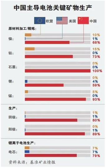 在生產(chǎn)動力電池所需主要原材料的加工、精煉、生產(chǎn)及回收方面,中國擁有絕對主導權。根據(jù)跟蹤全球電池供應鏈的基準礦業(yè)情報公司的數(shù)據(jù),在動力電池關鍵原材料方面,全球59%的鋰、68%的鎳、73%的鈷、93%的錳等正極材料都由中國供應。在負極材料方面,中國也擁有不可取代的優(yōu)勢,近乎100%的石墨都由中國出產(chǎn)。《彭博商業(yè)周刊》援引瑞銀集團分析師蒂姆·布什的話稱,石墨是電池負極必不可少的成分,但無論是天然石墨還是合成石墨,中國都擁有絕對主導優(yōu)勢。此外,去年全球范圍內鋰電池電解液、隔膜等材料也有超八成出貨量來自中國。