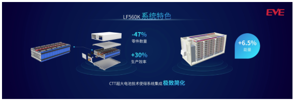 在系統(tǒng)集成的應(yīng)用中,相較于LF280K電池,使用LF560K電池可減少電芯數(shù)量50%、簡(jiǎn)化Pack零部件數(shù)量47%,提升生產(chǎn)效率30%。此外,通過簇級(jí)別尺寸的優(yōu)化,可提高集裝箱電量6.5%,完美適配行業(yè)標(biāo)準(zhǔn)集成方案,降低客戶使用成本。