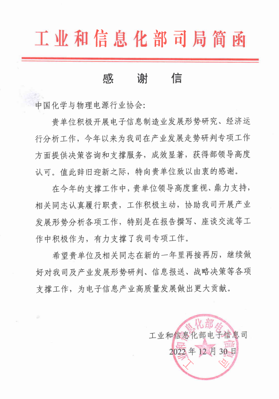 近日,工業(yè)和信息化部電子信息司給中國化學(xué)與物理電源行業(yè)協(xié)會發(fā)來感謝信,全文如下: