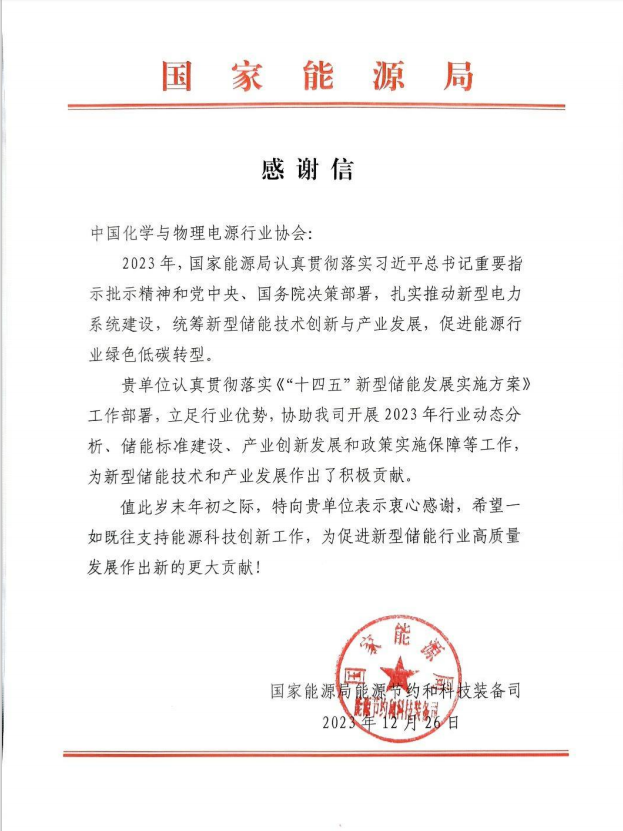 國家能源局向中國化學(xué)與物理電源行業(yè)協(xié)會發(fā)來感謝信