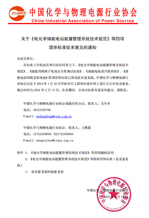 在標(biāo)準(zhǔn)工作組成員單位的共同努力下,《電化學(xué)儲(chǔ)能電站能量管理系統(tǒng)技術(shù)規(guī)范》、《儲(chǔ)能用鋰離子電池安全性測(cè)試標(biāo)準(zhǔn)》、《儲(chǔ)能電池液冷散熱器》、《儲(chǔ)能電站用固態(tài)鉛電池》四項(xiàng)團(tuán)體標(biāo)準(zhǔn)已形成征求意見稿。中國(guó)化學(xué)與物理電源行業(yè)協(xié)會(huì)決定于2024年1月16日開始對(duì)以上四項(xiàng)標(biāo)準(zhǔn)在網(wǎng)上進(jìn)行公示并征求意見,截止時(shí)間為2024年2月15日。在此期間,企業(yè)對(duì)標(biāo)準(zhǔn)有意見和建議,請(qǐng)聯(lián)系: