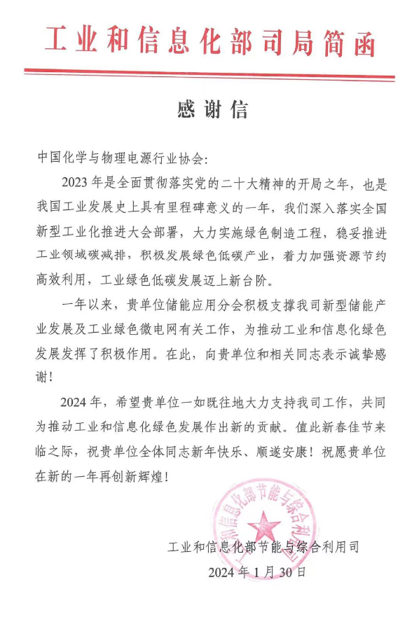 近日,工業(yè)和信息化部節(jié)能與綜合利用司向我會(huì)發(fā)來(lái)感謝信,肯定我會(huì)一年以來(lái)支撐該司新型儲(chǔ)能產(chǎn)業(yè)發(fā)展及工業(yè)綠色微電網(wǎng)有關(guān)工作,為推動(dòng)工業(yè)和信息化綠色發(fā)展發(fā)揮了積極作用。