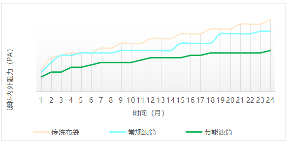 在除塵節(jié)能降耗能力方面,使用優(yōu)氪迅®高效節(jié)能濾筒的初始阻力更低,長(zhǎng)期運(yùn)行下阻力上升速度及運(yùn)行數(shù)值要更低。運(yùn)行阻力顯著下降,能耗得到有效控制,實(shí)現(xiàn)高效低耗運(yùn)行。