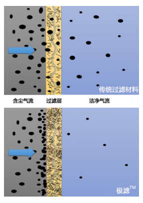 優(yōu)氪迅®高效節(jié)能濾筒運(yùn)用高效低阻的ePTFE覆膜技術(shù),顯著提升透氣性達(dá)30%以上;同時(shí),采用先進(jìn)的超細(xì)微孔表面過濾技術(shù),使得其對(duì)0.3μm粒徑的粉塵過濾效率>99%