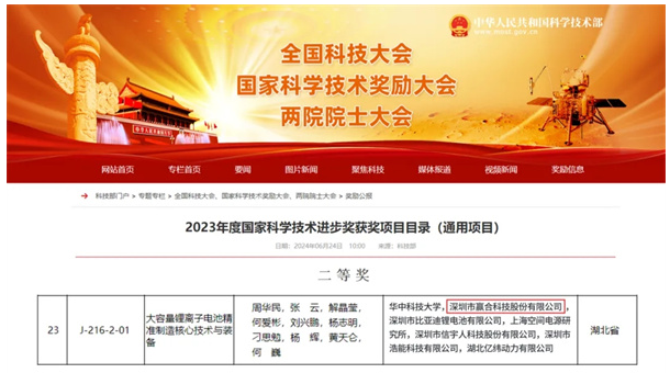 6月24日,全國(guó)科技大會(huì)、國(guó)家科學(xué)技術(shù)獎(jiǎng)勵(lì)大會(huì)和中國(guó)科學(xué)院第二十一次院士大會(huì)、中國(guó)工程院第十七次院士大會(huì)在北京人民大會(huì)堂召開(kāi)。贏合科技聯(lián)合華中科技大學(xué)等單位完成的《大容量鋰離子電池精準(zhǔn)制造核心技術(shù)與裝備》獲2023年度國(guó)家科學(xué)技術(shù)進(jìn)步二等獎(jiǎng)。