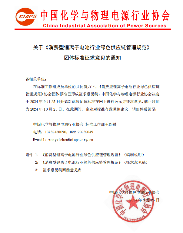 在標準工作組成員單位的共同努力下,《消費型鋰離子電池行業(yè)綠色供應鏈管理規(guī)范》協(xié)會團體標準已形成征求意見稿。中國化學與物理電源行業(yè)協(xié)會決定于2024年9月25日開始對此項團體標準在網上進行公示并征求意見,截止時間為2024年10月25日。在此期間,企業(yè)對標準有意見和建議,請郵件反饋至:
