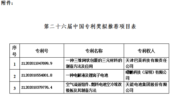 根據(jù)《國家知識(shí)產(chǎn)權(quán)局關(guān)于評(píng)選第二十六屆中國專利獎(jiǎng)的通知》(國知發(fā)運(yùn)函字〔2025〕152號(hào))通知要求,中國化學(xué)與物理電源行業(yè)協(xié)會(huì)組織開展評(píng)審工作已結(jié)束,現(xiàn)將擬推薦參評(píng)項(xiàng)目進(jìn)行公示,公示期為2025年11月27日至12月4日。公示期內(nèi),如有異議,請(qǐng)以書面形式向協(xié)會(huì)提出,并提供必要證明材料,異議應(yīng)當(dāng)簽署真實(shí)姓名或加蓋單位公章,并注明聯(lián)系方式。超出期限或匿名的異議不予受理。