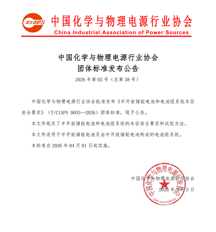 中國(guó)化學(xué)與物理電源行業(yè)協(xié)會(huì)批準(zhǔn)發(fā)布《半開放儲(chǔ)能電池和電池組系統(tǒng)本征安全要求》(T/CIAPS 0053—2026)團(tuán)體標(biāo)準(zhǔn),現(xiàn)予公告。