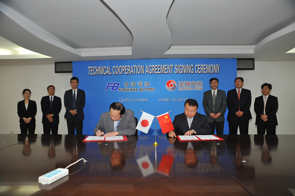 2014年6月10日,山東圣陽電源股份有限公司(以下簡稱圣陽電源)與日本古河電池株式會社(以下簡稱古河電池公司)在山東曲阜正式簽署合作協(xié)議,古河電池公司將具有國際領(lǐng)先水平的大容量、深循環(huán)、超長壽命鉛炭技術(shù)儲能系列電池產(chǎn)品授權(quán)給圣陽電源公司在中國的工廠進(jìn)行本地化生產(chǎn),并在中國日益快速發(fā)展的新能源市場及通信電源市場進(jìn)行推廣和銷售,雙方在各自國家和面向全球市場共用統(tǒng)一的FCP系列產(chǎn)品代碼。