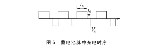 圖5中,Q1和Q2集成在一個IPM中。Q2打開時給蓄電池組充電,Q1打開時蓄電池組通過R1放電;蓄電池組給負載供電時,Q1、Q2均閉合。為改善功率開關(guān)器件的工作狀態(tài),主電路中采用了軟開關(guān)技術(shù)。在采用大電流充電的情況下,由于長時間對蓄電池組進行充電,電荷堆積于電池電極上而產(chǎn)生反向電壓,實際上表現(xiàn)為電池內(nèi)阻的增加,不但蓄電池中的有效化學(xué)物質(zhì)不能完全參加化學(xué)反應(yīng),降低了蓄電池組容量的利用率,而且還會引起蓄電池組的嚴重發(fā)熱,從而影響充電速度與質(zhì)量,繼而影響蓄電池組的性能和壽命。消除它的有效方法是采用負脈沖方法:在電池兩端瞬間放電去除電極上堆積的電荷,從而改變蓄電池固有的指數(shù)曲線形式的充電接受特性,提高電池的受電能力。為此,采用了“充-停-放-充-停-放”循環(huán)充電的充電策略。其脈沖充電特性如圖6所示,時間參數(shù)由蓄電池的參數(shù)決定。