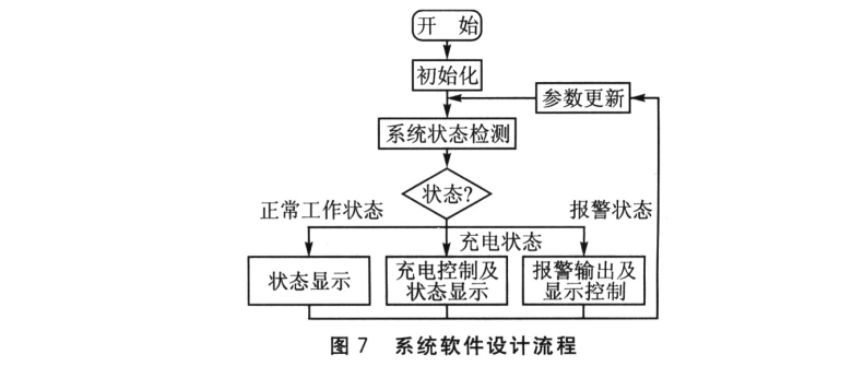 本系統(tǒng)軟件設(shè)計流程如圖7所示。系統(tǒng)啟動后,立即執(zhí)行系統(tǒng)初始化程序,從EEPROM中讀取上次運行得到的參數(shù)。然后開始讀取溫度傳感器中的數(shù)據(jù)以獲取當前系統(tǒng)溫度,再調(diào)用A/D采樣子程序以獲取10位精度的電壓電流信號數(shù)據(jù)。經(jīng)過處理可以得到最終的蓄電池運行狀態(tài),根據(jù)不同的狀態(tài)進行各自的處理程序,并將狀態(tài)數(shù)據(jù)輸出到數(shù)碼管顯示。系統(tǒng)在運行時將根據(jù)已有的數(shù)據(jù)和監(jiān)測到的數(shù)據(jù),自動對參數(shù)進行修正,以準確地反映蓄電池的內(nèi)部參數(shù),實現(xiàn)系統(tǒng)管理的智能化。