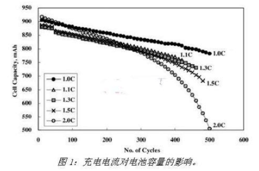 下面是一個4.2V/900mAH LiCoO2電芯的不同電流充電與電池容量的關(guān)系曲線(參圖一),我們可以看出大約500個充放周期后,小電流充電的電池容量明顯大于大電流充電的電池容量。