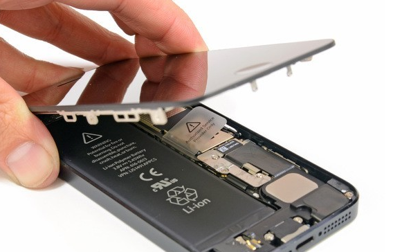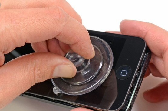 - 動用吸盤把iPhone 5的屏幕吸起,但不完全剝離,因為在機身頂部,屏幕組件仍有電線與主板連接,不可蠻力拉扯。