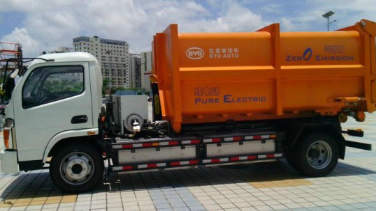 除了這款編號為T5的純電動輕卡外,記者還看到比亞迪T7垃圾運輸車,從底部的四塊電池組可以看出,T7可能是T5的增大版本,要求的承載重量比T5要大,主要用于城市垃圾運輸周轉。