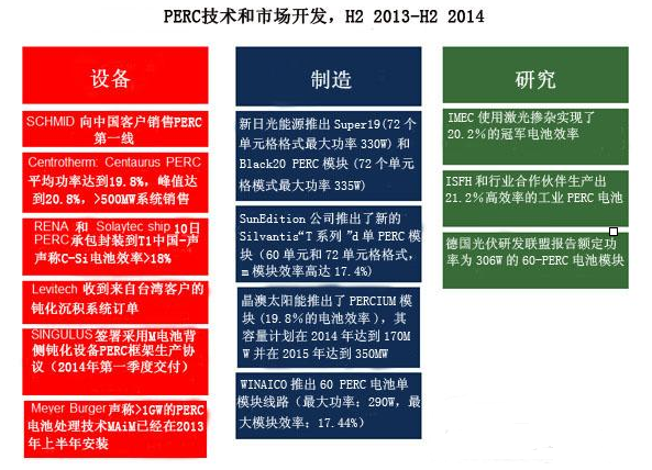 在過去的一年中,鈍化發(fā)射極背面接觸(PERC) 的制造進(jìn)展已經(jīng)開始揭示這個(gè)新電池結(jié)構(gòu)的全部技術(shù)和商業(yè)潛能。它的設(shè)備和制造工藝的發(fā)展,以及研究,如下圖…
