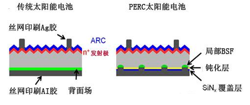 PERG技術(shù)通過在電池的后側(cè)上(如下面圖像中的黃色層所示)添加一個(gè)電介質(zhì)鈍化層來提高轉(zhuǎn)換效率。標(biāo)準(zhǔn)電池結(jié)構(gòu)中更高的效率水平受限于光生電子重組的趨勢。PERC電池最大化跨越了P-N結(jié)的電勢梯度,這使得電子更穩(wěn)定的流動(dòng),減少電子重組,以及更高的效率水平。