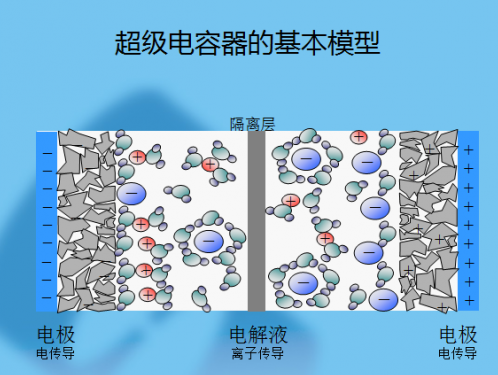 超級電容器可以被視為懸浮在電解質(zhì)中的兩個無反應活性的多孔電極板,在極板上加電,正極板吸引電解質(zhì)中的子,負極板吸引正離子,實際上形成兩個容性存儲層,被分離開的正離子在負極板附近,負離子在正極板附近。
