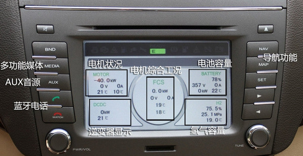 中控臺顯示的數(shù)據(jù)比較復雜,不過通過上面的幾個英文可以猜出一些。電池以及氫氣容量淺顯易懂,不過中間的綜合工況以及電機狀況這些就有些晦澀難明了。比如電機狀況出現(xiàn)的負值,其實是表示剎車等情況下能量回收的效果。