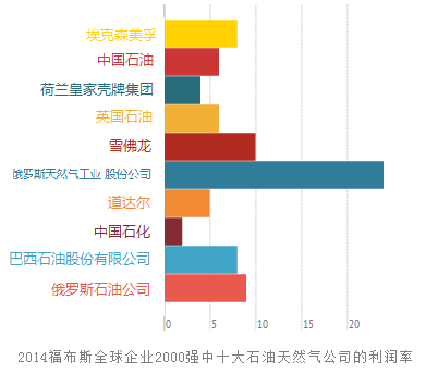 耐人尋味的是,十大石油天然氣公司的利潤(rùn)率差異很大。俄羅斯天然氣工業(yè)股份公司(Gazprom)以24%的利潤(rùn)率遙遙領(lǐng)先,盡管烏克蘭局勢(shì)持續(xù)動(dòng)蕩以及歐洲市場(chǎng)上出現(xiàn)來(lái)自頁(yè)巖氣的競(jìng)爭(zhēng)。由于中國(guó)政府現(xiàn)在正在改革國(guó)有企業(yè)的結(jié)構(gòu),并且允許市場(chǎng)發(fā)揮更大的作用,中國(guó)國(guó)有企業(yè)中石化的利潤(rùn)率最低(2%)。