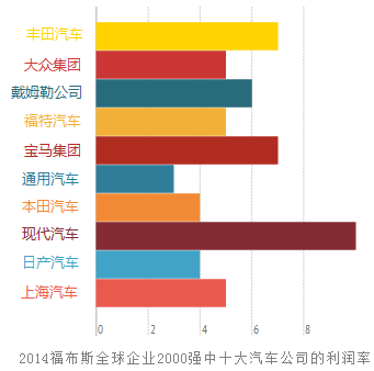 與十大銀行和十大制藥公司的出色表現(xiàn)相比,十大汽車公司的平均利潤(rùn)率只有6%。在十大汽車公司當(dāng)中,通用汽車(General Motors)的利潤(rùn)率最低(3%),盡管市場(chǎng)對(duì)該公司新任首席執(zhí)行官瑪麗·巴拉(Mary Barra)的復(fù)興計(jì)劃寄予厚望。另一家美國(guó)汽車制造商——福特汽車的利潤(rùn)率與其國(guó)際競(jìng)爭(zhēng)對(duì)手相比也相對(duì)較低(5%)。利潤(rùn)率最高的是韓國(guó)的現(xiàn)代汽車(10%),今年該公司在榜單中的排名提升兩位至第87。