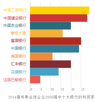全球十大銀行去年盈利表現(xiàn)也不錯(cuò),平均利潤(rùn)率為19%。連續(xù)第二年榮登福布斯全球企業(yè)2000強(qiáng)榜首的中國(guó)工商銀行以29%的利潤(rùn)率摘得最賺錢銀行的桂冠。法國(guó)最大的銀行——法國(guó)巴黎銀行(BNP Paribas,利潤(rùn)率為5.2%)以很大差距落后于全球十大銀行中的其他銀行,由于美國(guó)監(jiān)管機(jī)構(gòu)對(duì)該銀行參與的可能會(huì)受到美國(guó)制裁的交易進(jìn)行調(diào)查,該銀行撥出了11億美元準(zhǔn)備金。